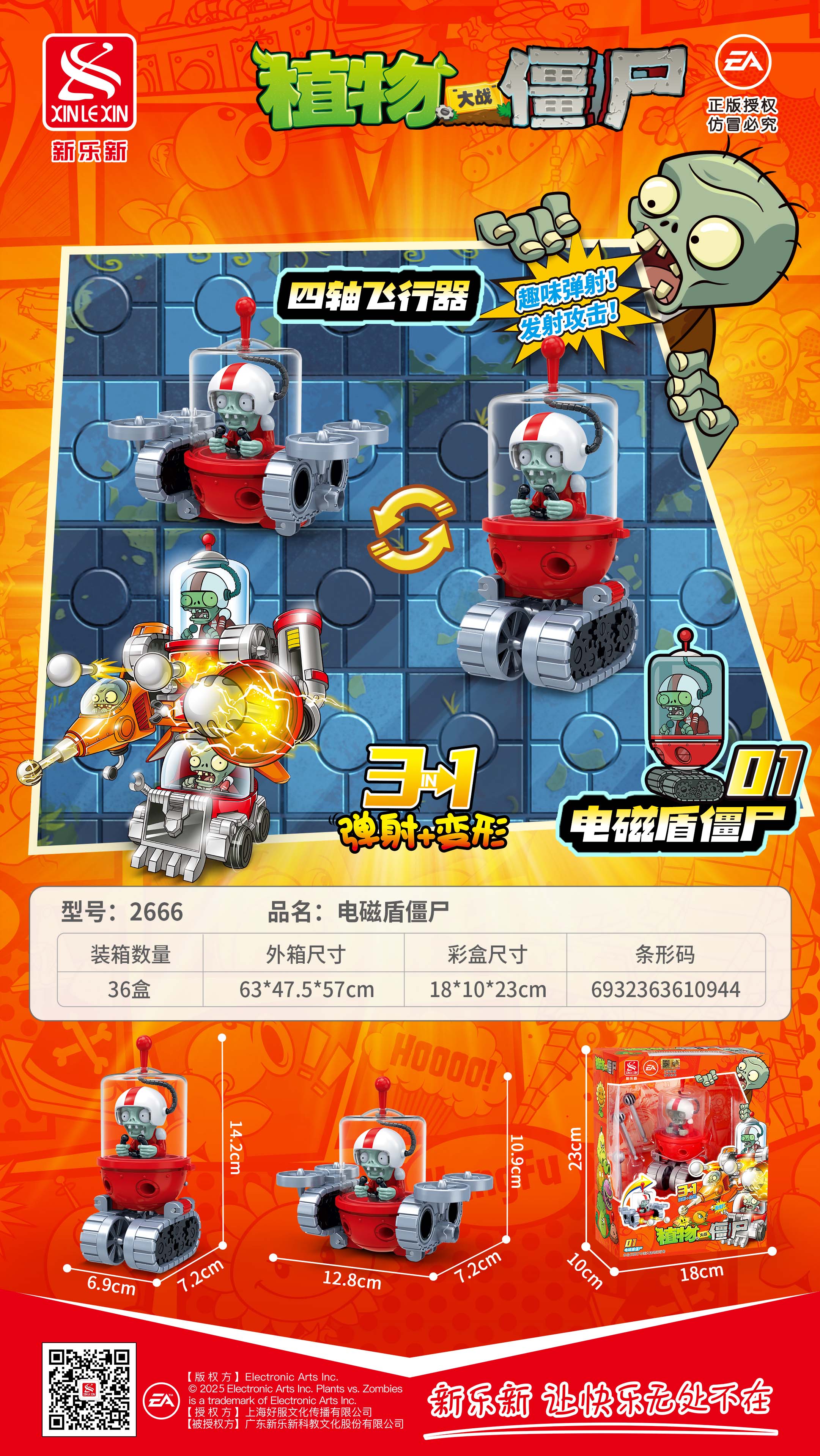 產(chǎn)品規(guī)格:電磁盾僵尸:6.9*7.2*14.2cm,四軸飛行器:12.8*7.2*10.9